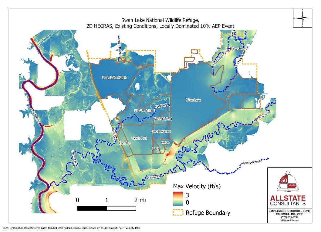 To help offset environmental impacts from the proposed 2,350-acre Roy Blunt Reservoir, Allstate Consultants led hydraulic modeling and design for major restoration work at Swan Lake National Wildlife Refuge (SLNWR). Efforts were focused on restoring natural water flow and improving wetland habitat across much of the 17-square-mile refuge.